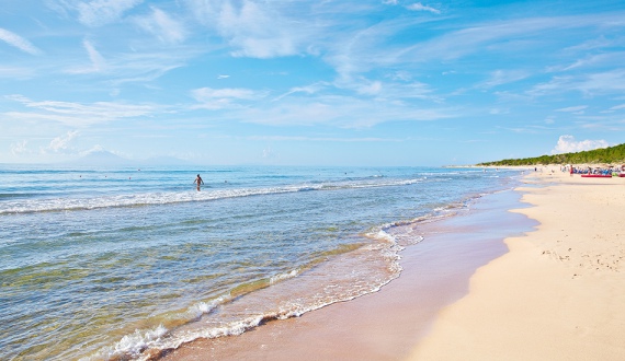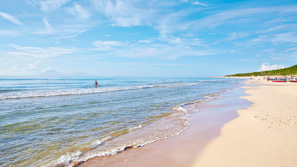 Постепенный и пологий вход в сапфировые воды идеально подходит для детей. 2-х километровый песчаный пляж располагает душевыми и кабинками для переодевания, шезлонгами, пляжными полотенцами и зонтиками. Пляж награжден Голубым флагом за соблюдение директив европейской программы: за качество воды, рациональное использование окружающей среды, безопасность, услуги и удобства, экологическую осознанность и просвещение. Бесплатные удобства включают: Пляжные полотенца, душевые и кабинки для переодевания, зонтики и шезлонги (бассейн с пресной водой).